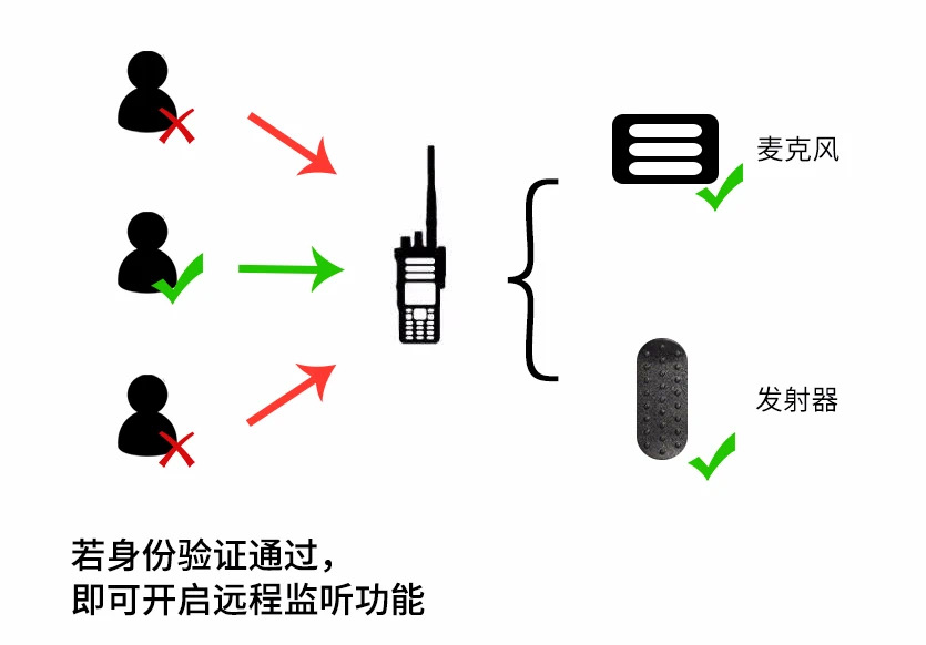 需要身份驗證的對講機遠程監(jiān)聽功能,允許用戶通過菜單向目標(biāo)對講機發(fā)起遠程監(jiān)聽請求。請求成功后,目標(biāo)對講機的麥克風(fēng)和發(fā)射器將被激活,以便遠程監(jiān)聽。