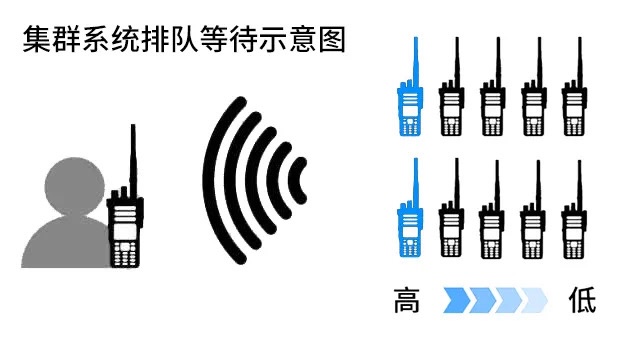 集群系統(tǒng)中當(dāng)用戶在排隊等待語音信道時,高優(yōu)先級用戶排在前面,低優(yōu)先級排在后面。這有助于實現(xiàn)重要通話和緊急通話的優(yōu)先傳送。
