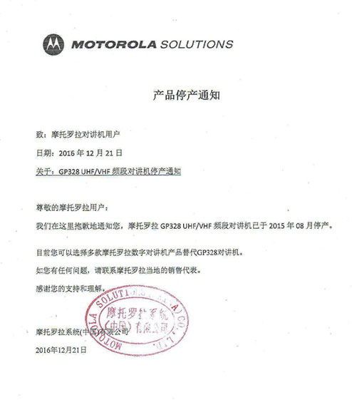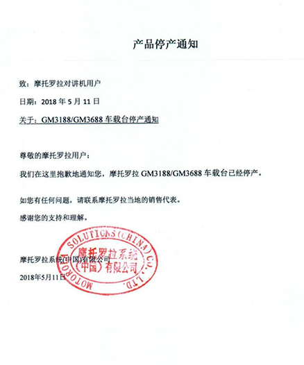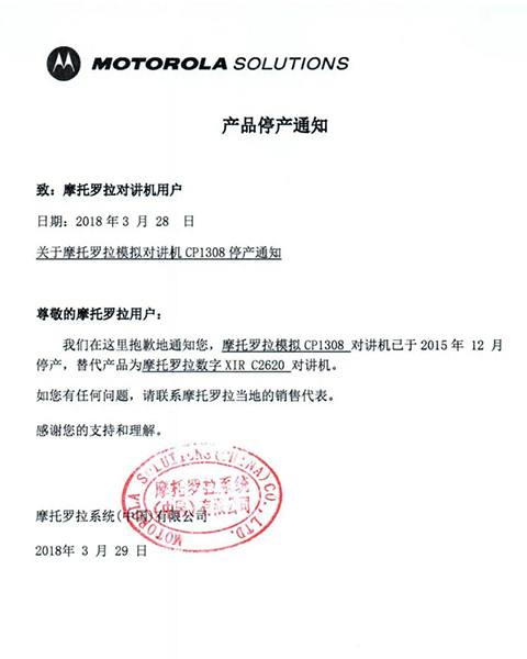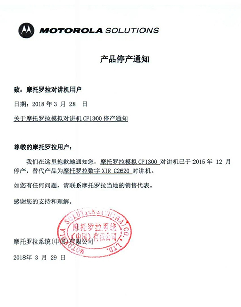 摩托羅拉系統(tǒng)根據(jù)國(guó)家相關(guān)要求,已于2015年逐步停止了模擬機(jī)全球工廠的生產(chǎn),同時(shí)按照國(guó)家有關(guān)規(guī)定,相關(guān)機(jī)型的《無(wú)線電發(fā)射設(shè)備型號(hào)核準(zhǔn)證》及《防爆電氣設(shè)備防爆合格證》均已不再辦理延期手續(xù)。